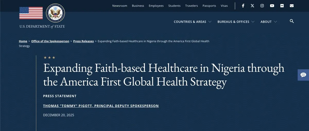 On 20 December 2025, the United States Department of State signed a five-year bilateral health Memorandum of Understanding (MOU) with the Federal Republic of Nigeria, aimed at strengthening Nigeria’s health system with a strong focus on supporting Christian faith-based health care providers.